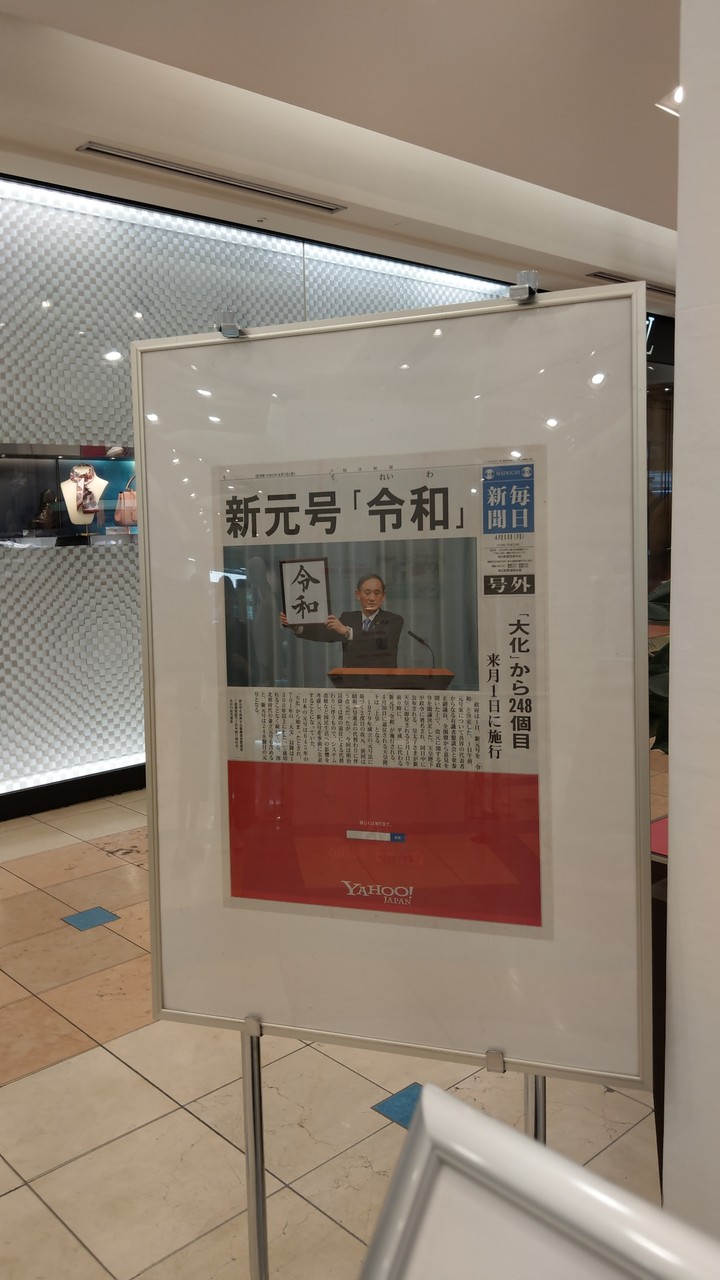 ちなみにゴールデンウィーク中、上のフロアでは上皇、上皇后陛下のお写真をパネル展示してある展示会が行われていたんですが、そのエリアにも新元号発表セット、ありましたねー。