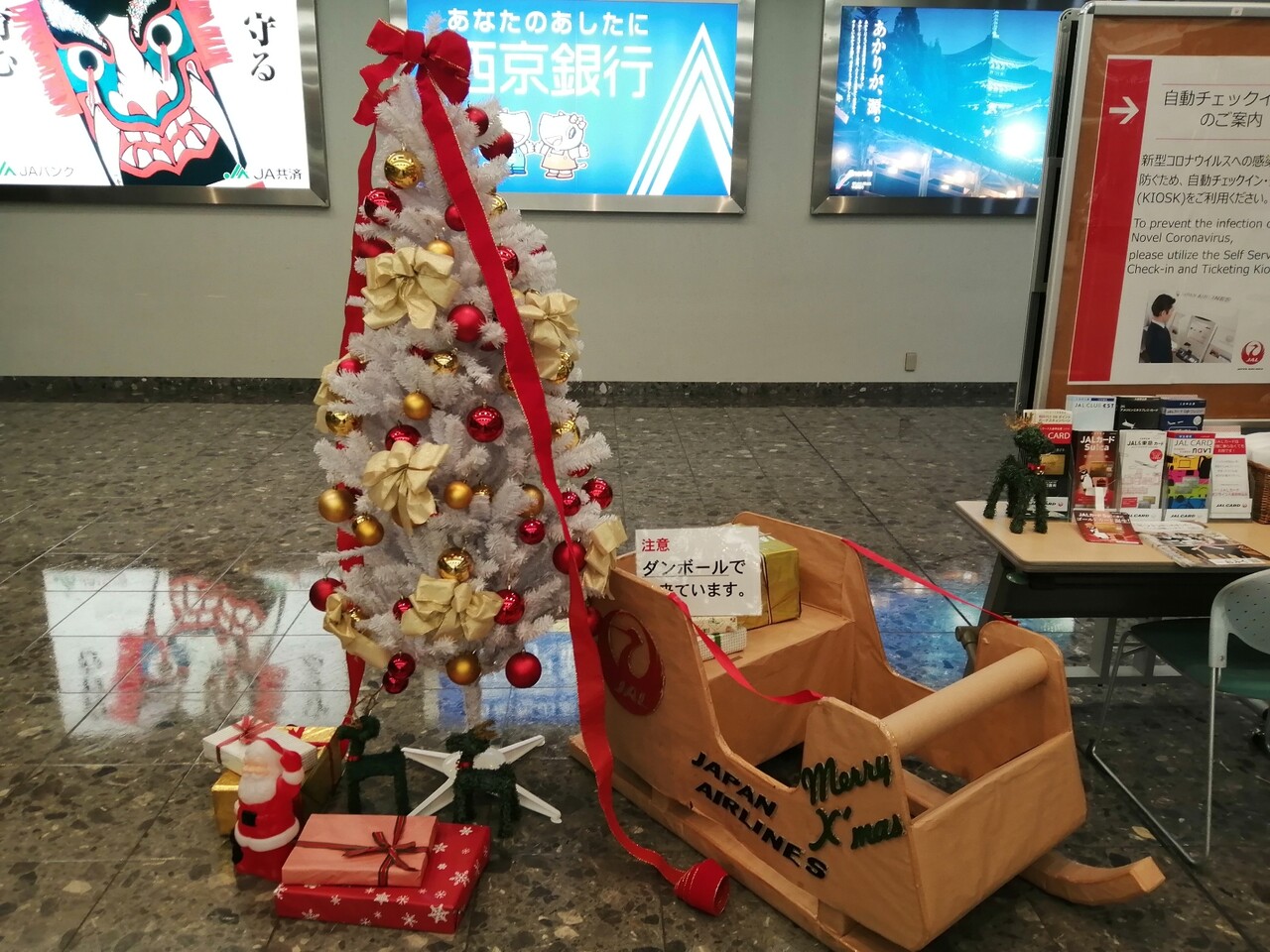まずはJALのカウンター前にはダンボールでできたそりとツリーが。