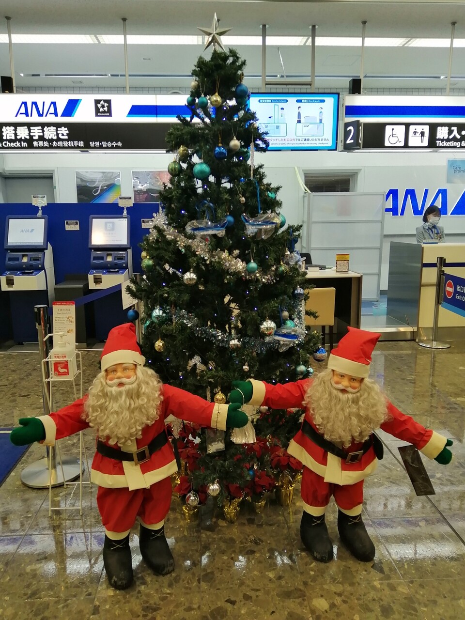 2社がコードシェアで飛んでいることもあっておふたりのサンタさんがお客さまを見送ってらっしゃいました。